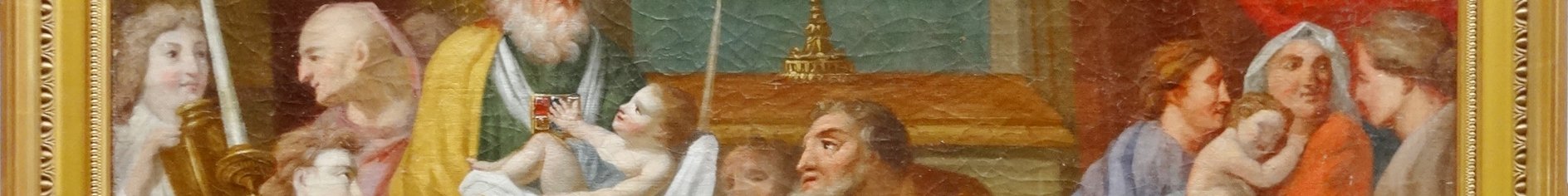 La Présentation de Jésus au Temple est un événement de la vie de Jésus relaté dans l’Évangile selon Luc (2:22s). Accomplissant une prescription de la loi juive — « Tout mâle premier-né sera consacré au Seigneur » — les parents de l’enfant Jésus le présentent et l’offrent au Temple de Jérusalem. Représentation néo-classique au style ébauché, peint à la brosse. Le plissé travaillé des mises évoque de loin en loin la peinture classique italienne.