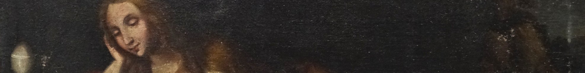 Représentation de Marie Madeleine avec les cheveux longs et dénoués, pour signifier son repentir et sa pénitence. La croix et l’oeuf évoquent la mort et et la résurrection du Christ.
