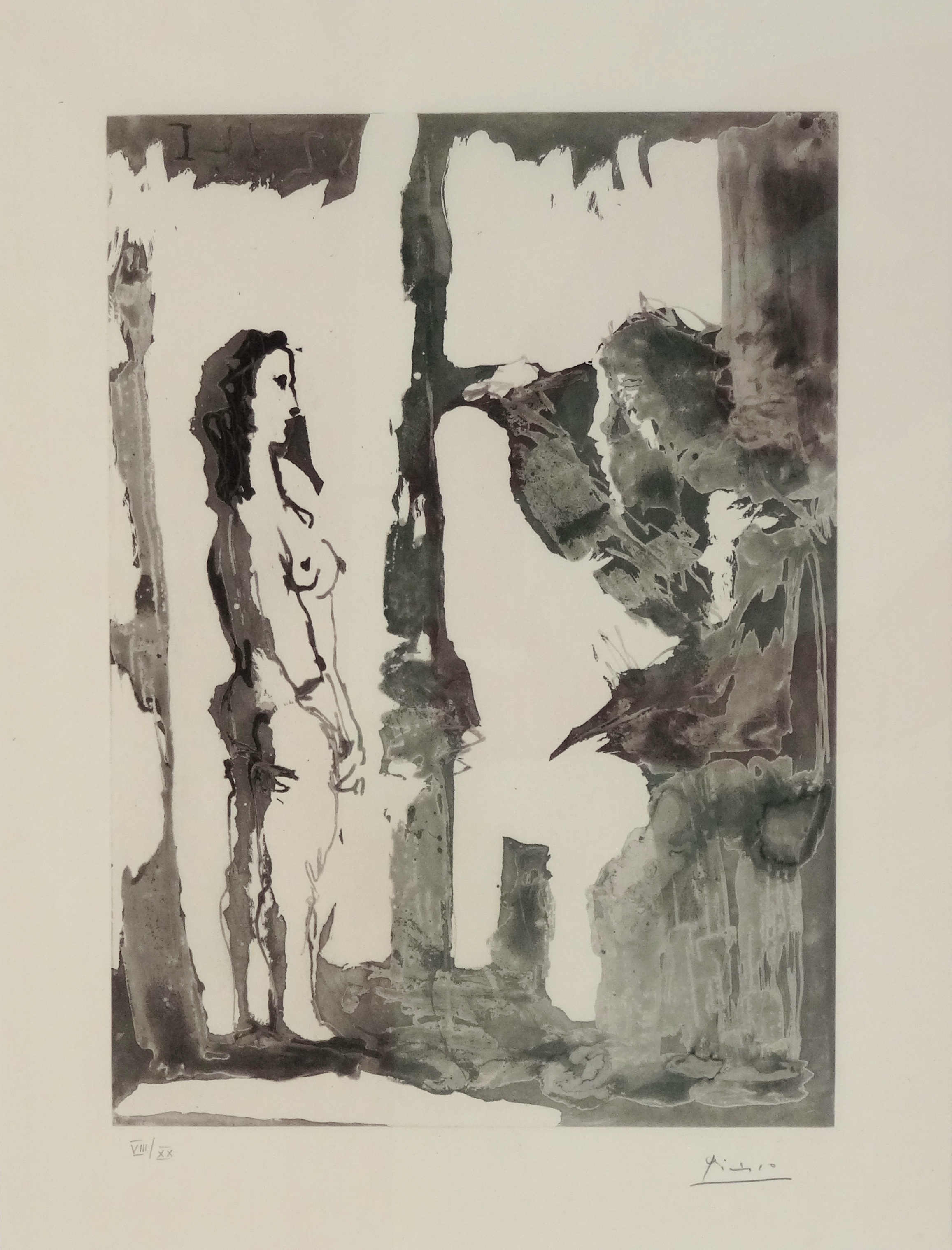 Pablo PicassoAquatinte signée au crayon par l’artiste, justifiée VII/XX. Tirée sur Japon. Référencée sous le n°1184 au catalogue raisonné de l’oeuvre gravé et lithographié (Bloch), T.I, p.258. Illustration pour Sable mouvant de Reverdy.